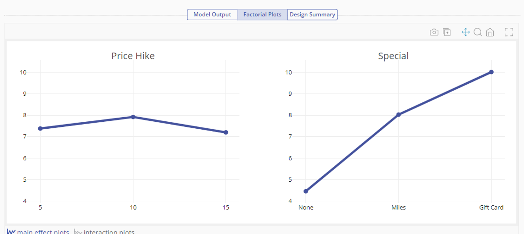 - Click on the interaction plots link below the main effects screen to see the interaction plot of Price Hike and Special. The interaction plot shows that Profit% is maximized (the goal) when Price Hike is set to 15% and with Special set to either Gift Card or Miles.