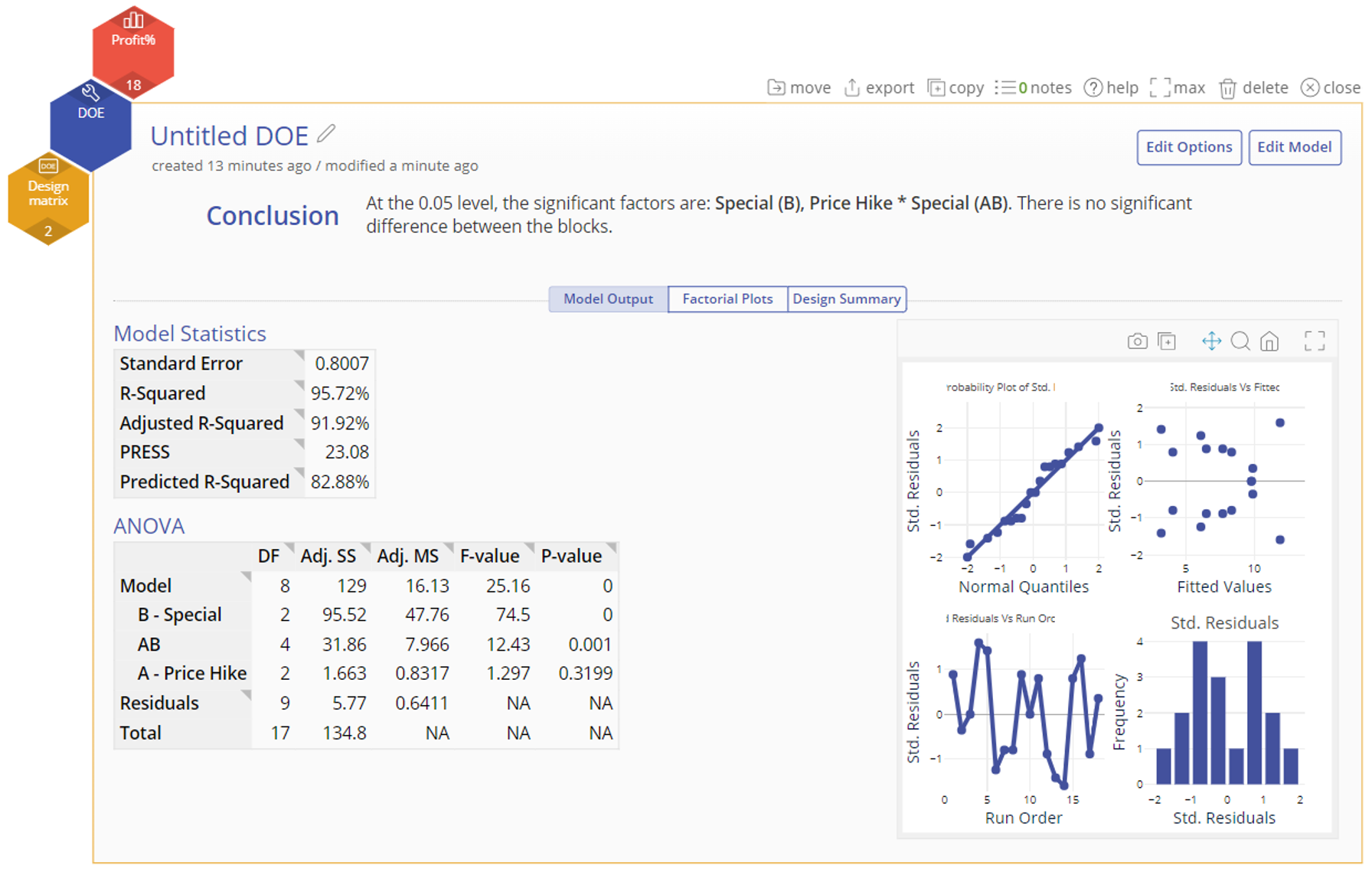 - Model Output Screen: This screen shows the reduced model along with the model statistics and test results indicating the significance of the effects. Note the Conclusion statement at the top indicating the significant effects.