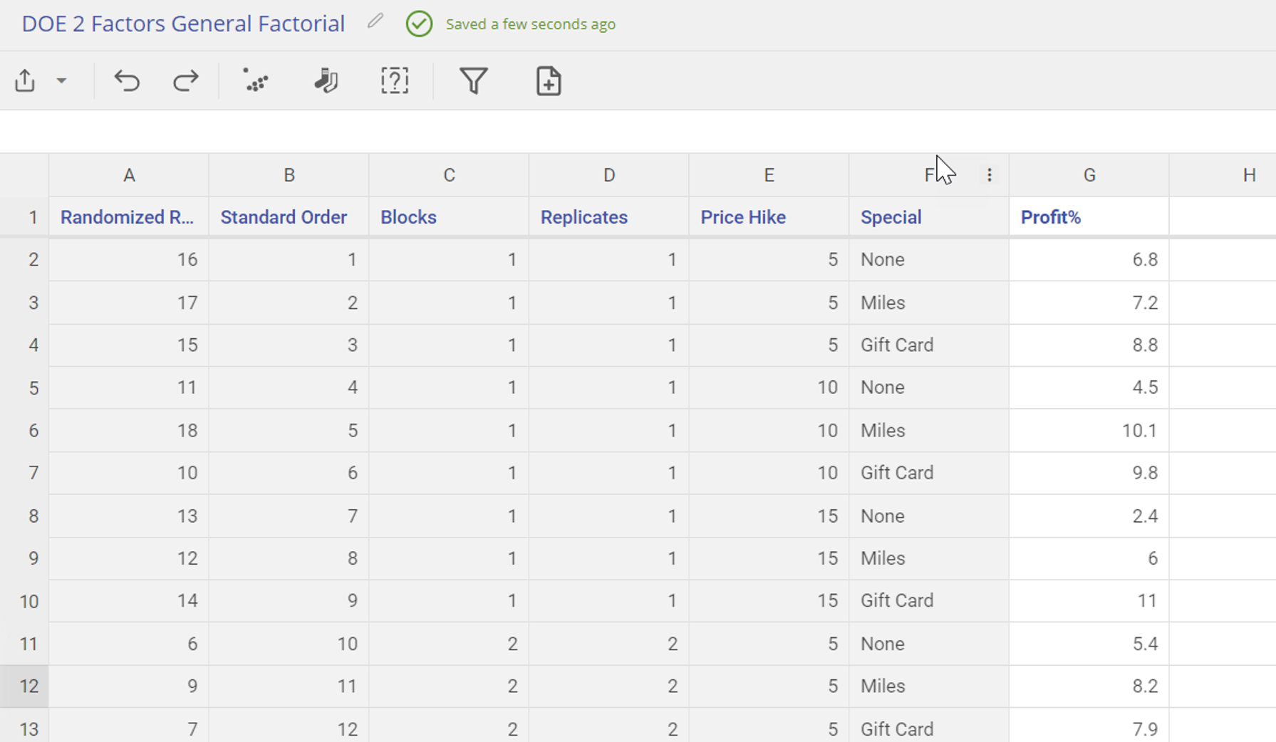 - The design matrix opens up from the data sources panel. It contains all the information about the design, with a blank column at the end for the Response data; normally you would run the experiment by following the Randomized run order, and enter the response data into this column. However, we already have the response data, so we want to organize the table by the Standard Order. This way we can simply enter or copy-paste the data, since the run order of both designs is identical (i.e., run #1 in the design we just created is the same as run #1 in the design table provided.) Sort the created design in the Standard order as well by right-clicking on the Standard order column, and clicking Sort > A -> Z: