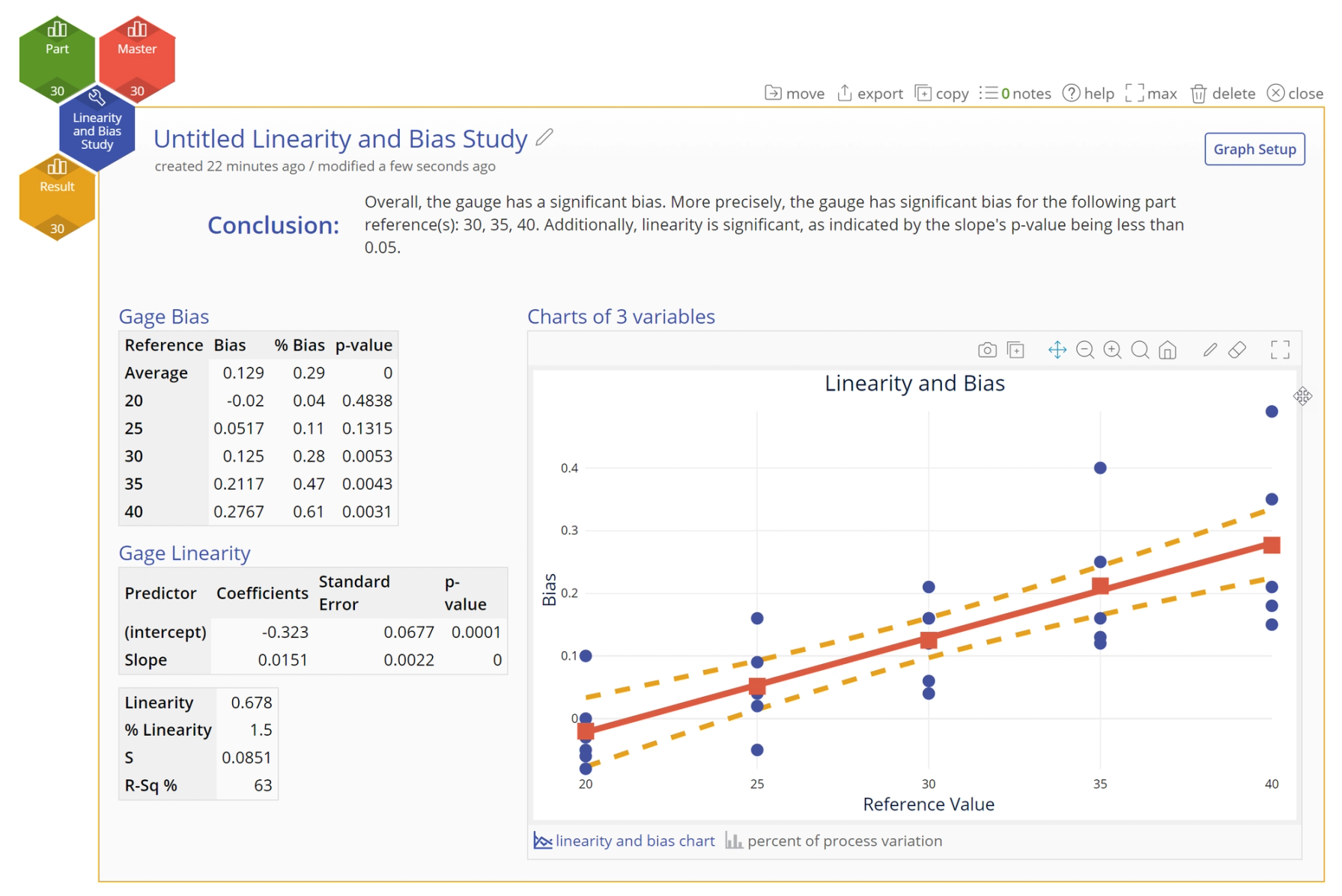 - Gauge Linearity - This calculates the intercept and slope of the line that connects the low reference value of the range to the high reference value of the range. It contains a p-value for the slope of the line to indicate whether linearity is significant or not for this gauge.