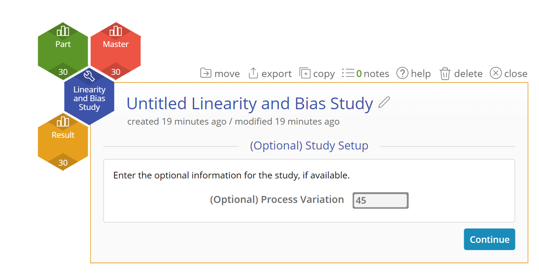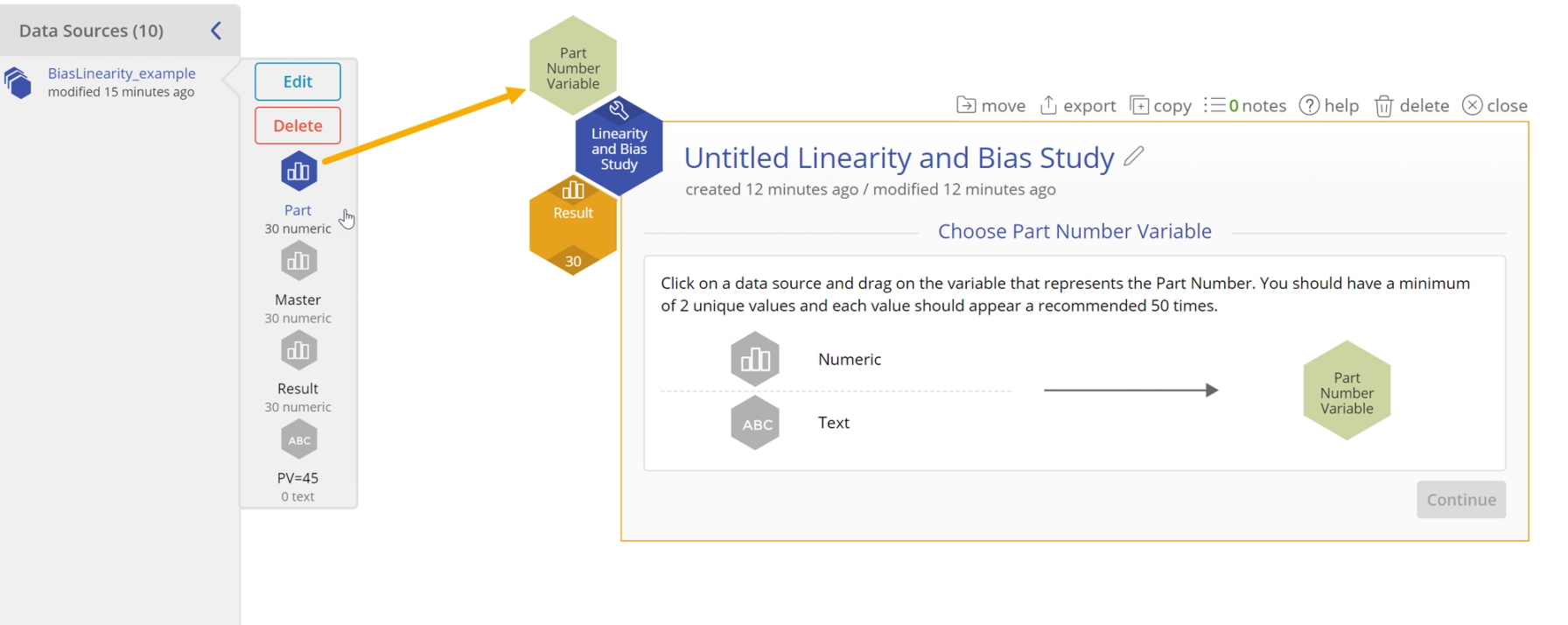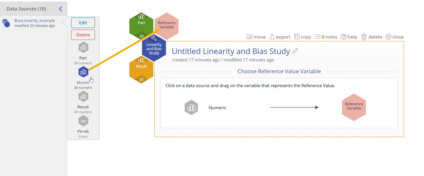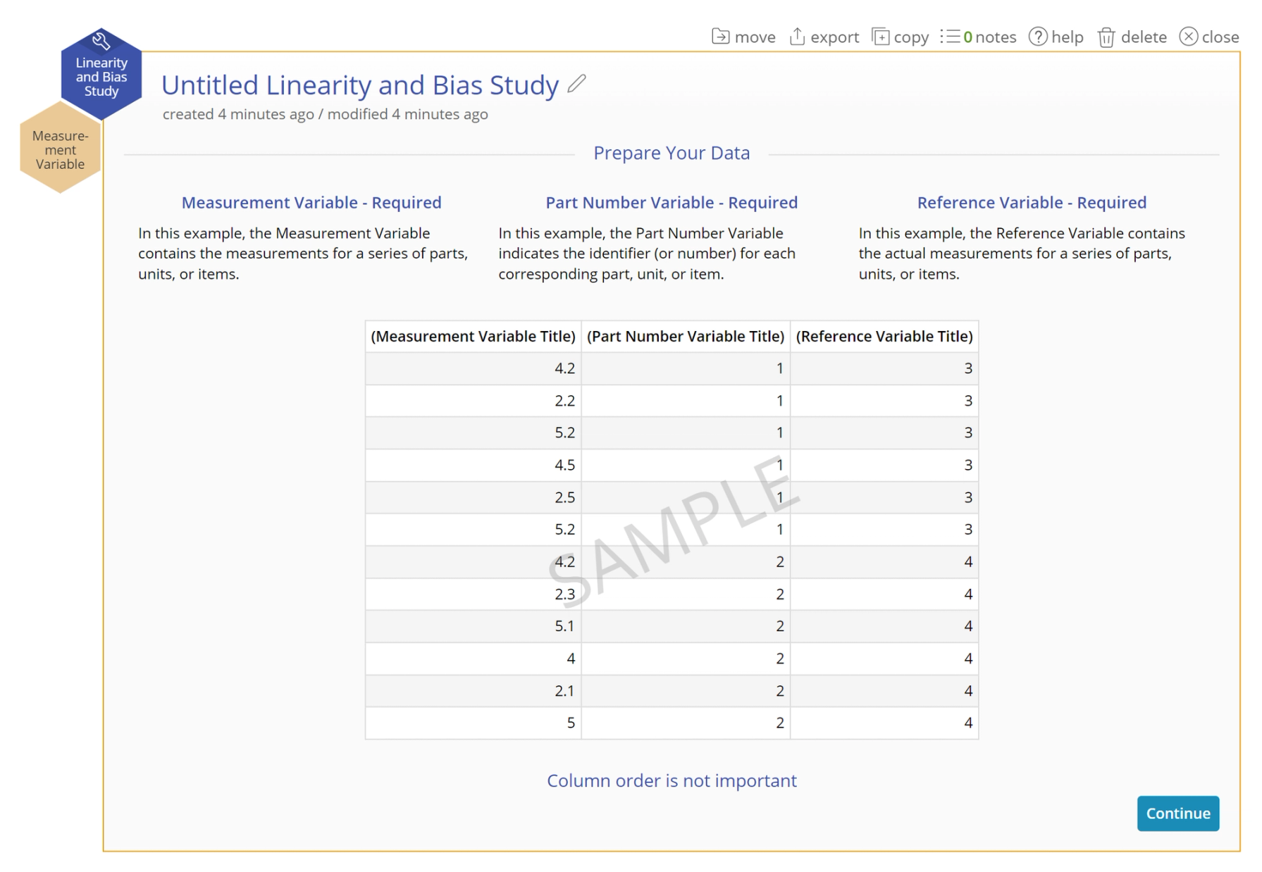 1. Go to Measure > Measurement System Analysis (MSA) in the DMAIC menu (or Quality Tools in the Standard menu) and open the Linearity and Bias Study tool onto the workspace. Click Continue.