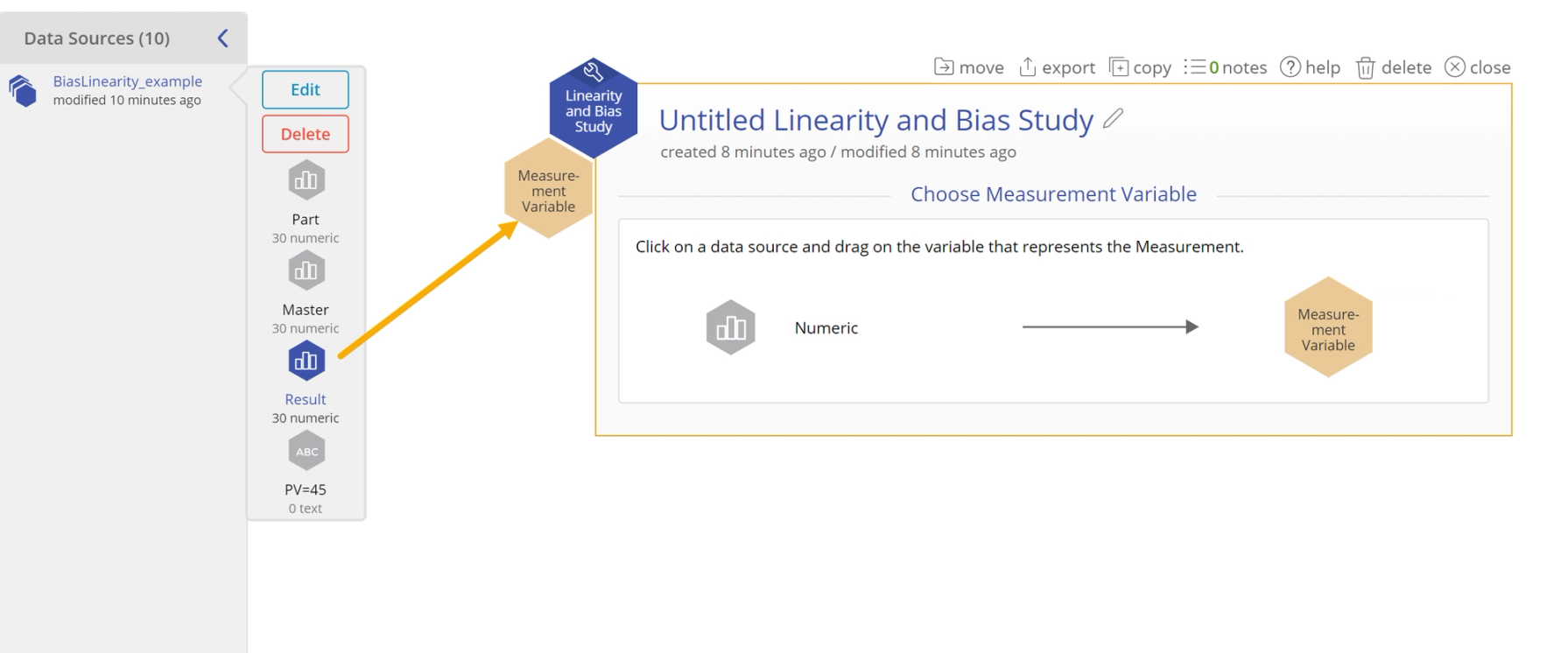 2. Upload the data source. Click on the data source and drag the variable Result onto the Measurement Variable hexagon.