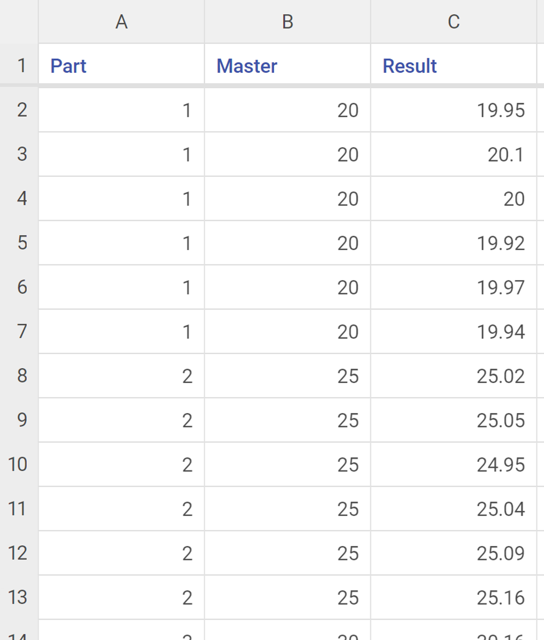 - Reference Variable (Required): This variable contains the associated reference (true) value for a given part. This will be repeated for each measurement.