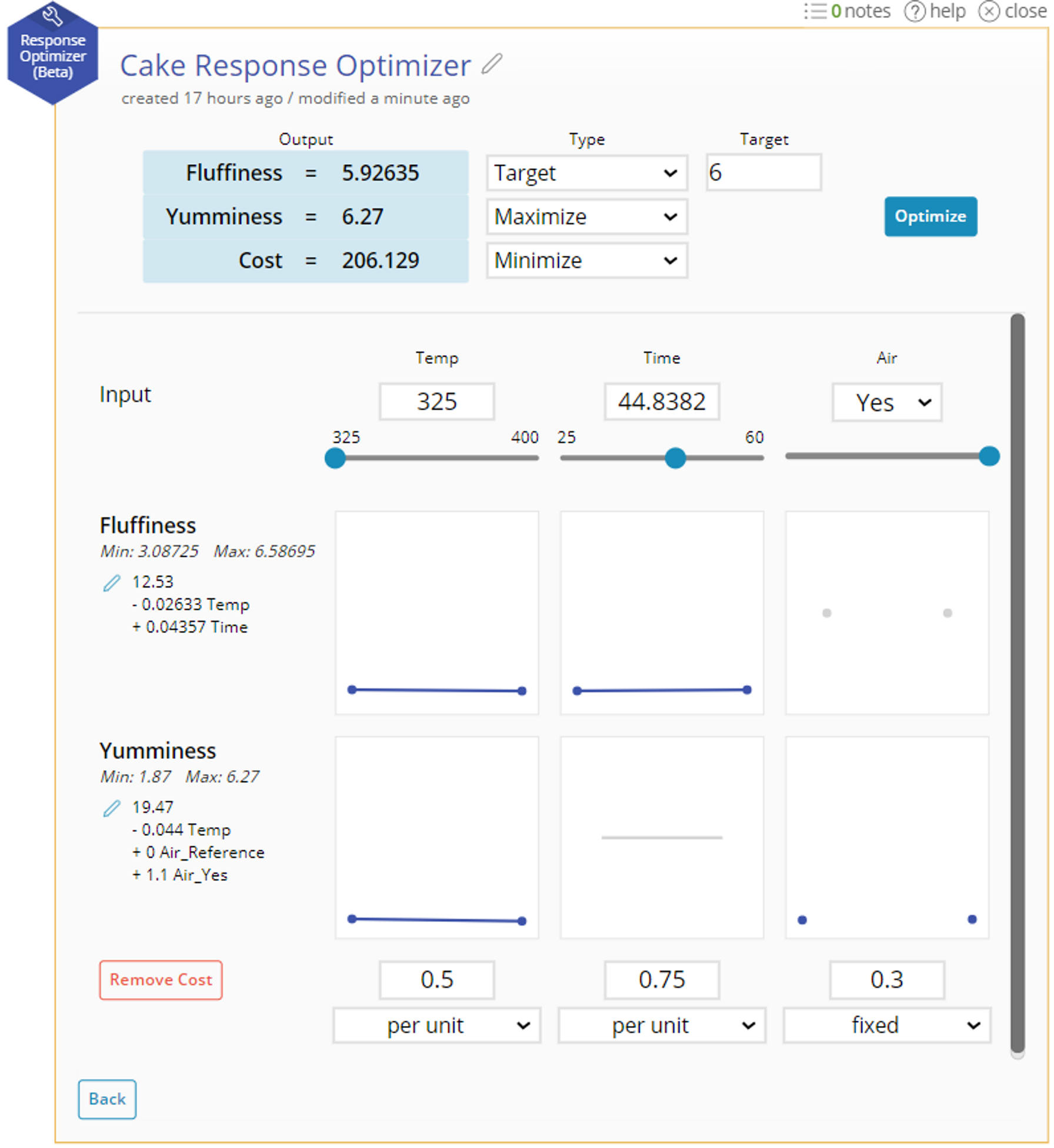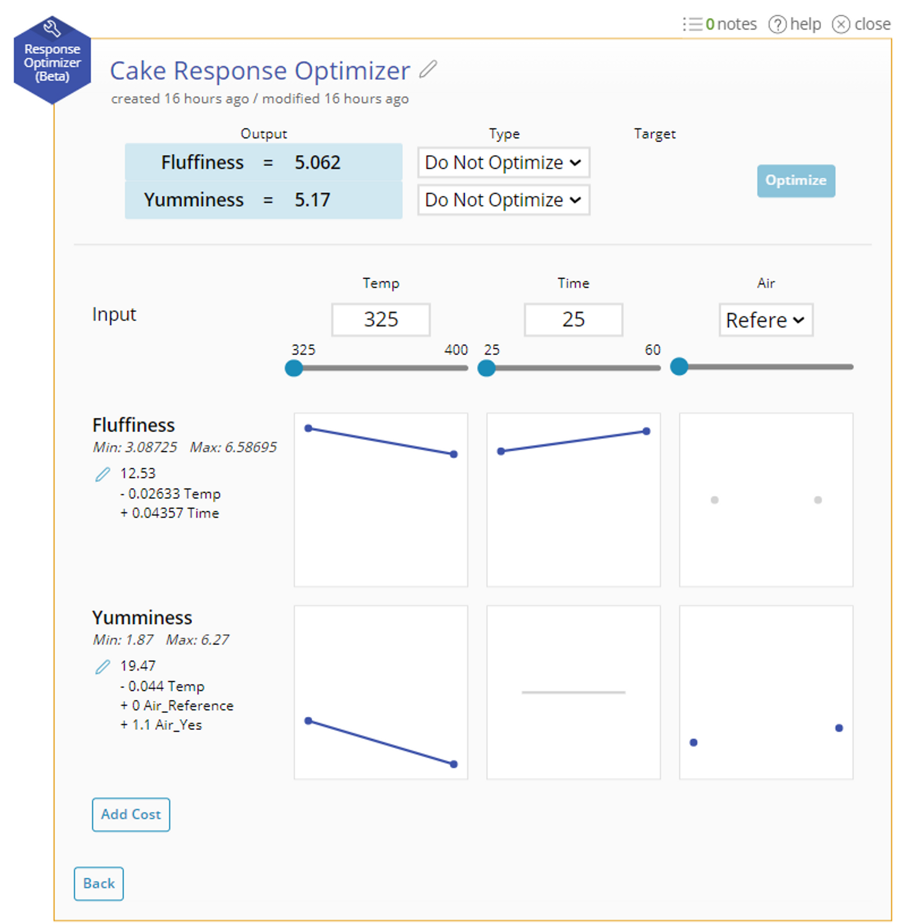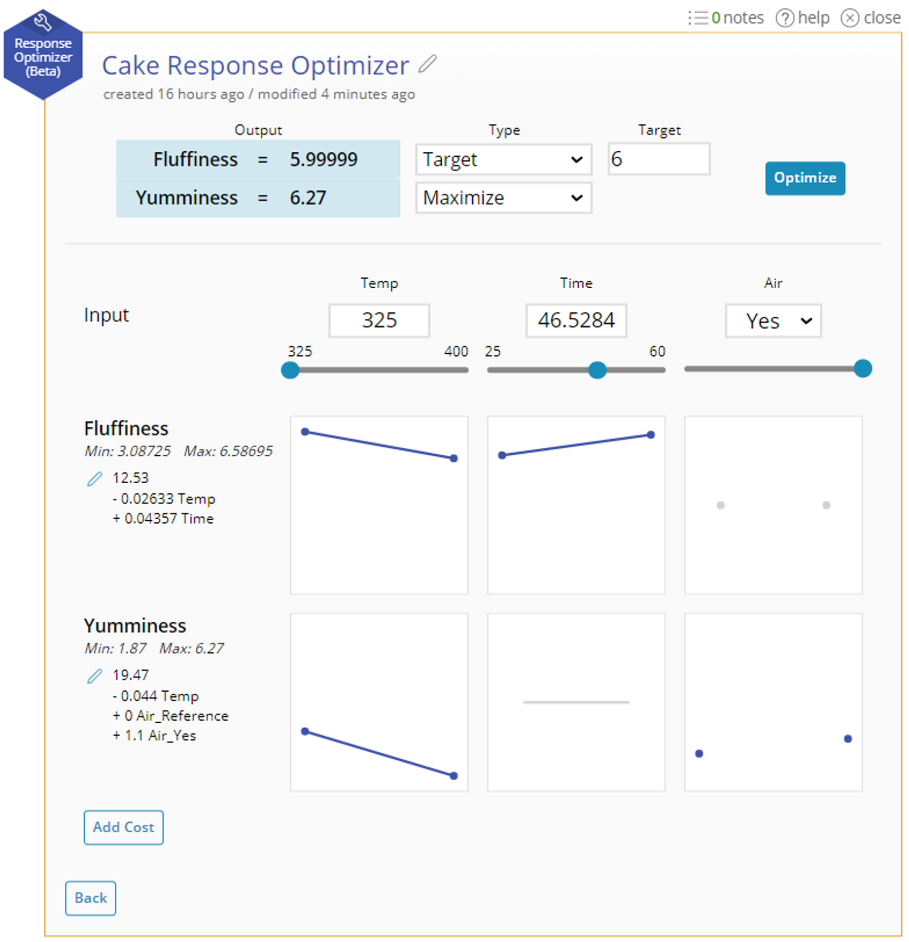 Notice that ‘Add Cost’ button in the bottom left? You can assign cost to the inputs (per unit or fixed) and optimize the responses taking cost into consideration, meaning optimize all responses while minimizing the overall cost. Here’s what it looks like with some entries: $0.05 per degree of Temp, $0.075 per minute of Time, and $0.3 fixed cost for turning on Airflow. The optimal solution now is: