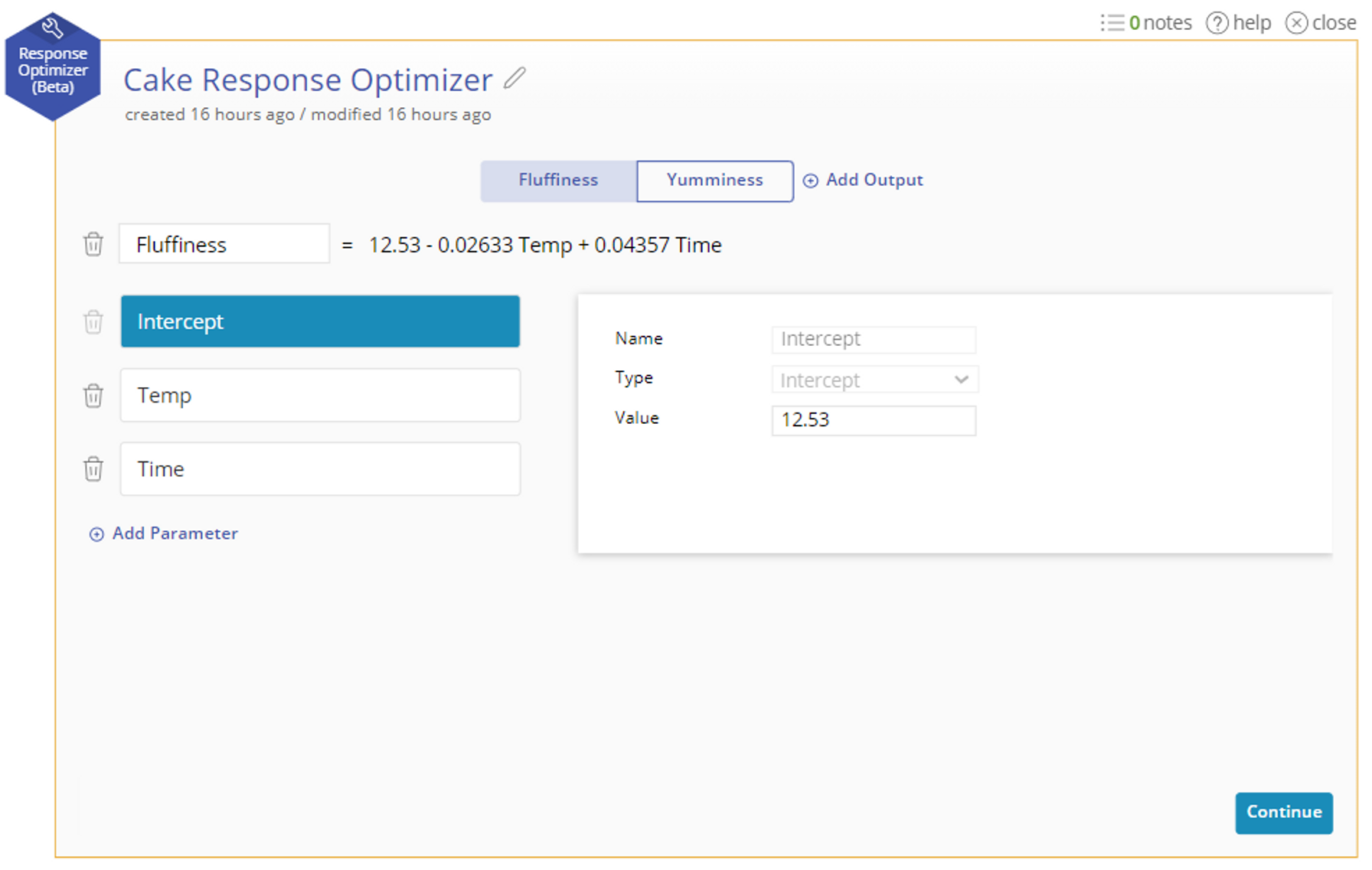 With the requisite information - response equations, minimum and maximum for each input factor – captured, we're ready for the optimization. Clicking on the Continue button takes us to the optimizer settings screen: