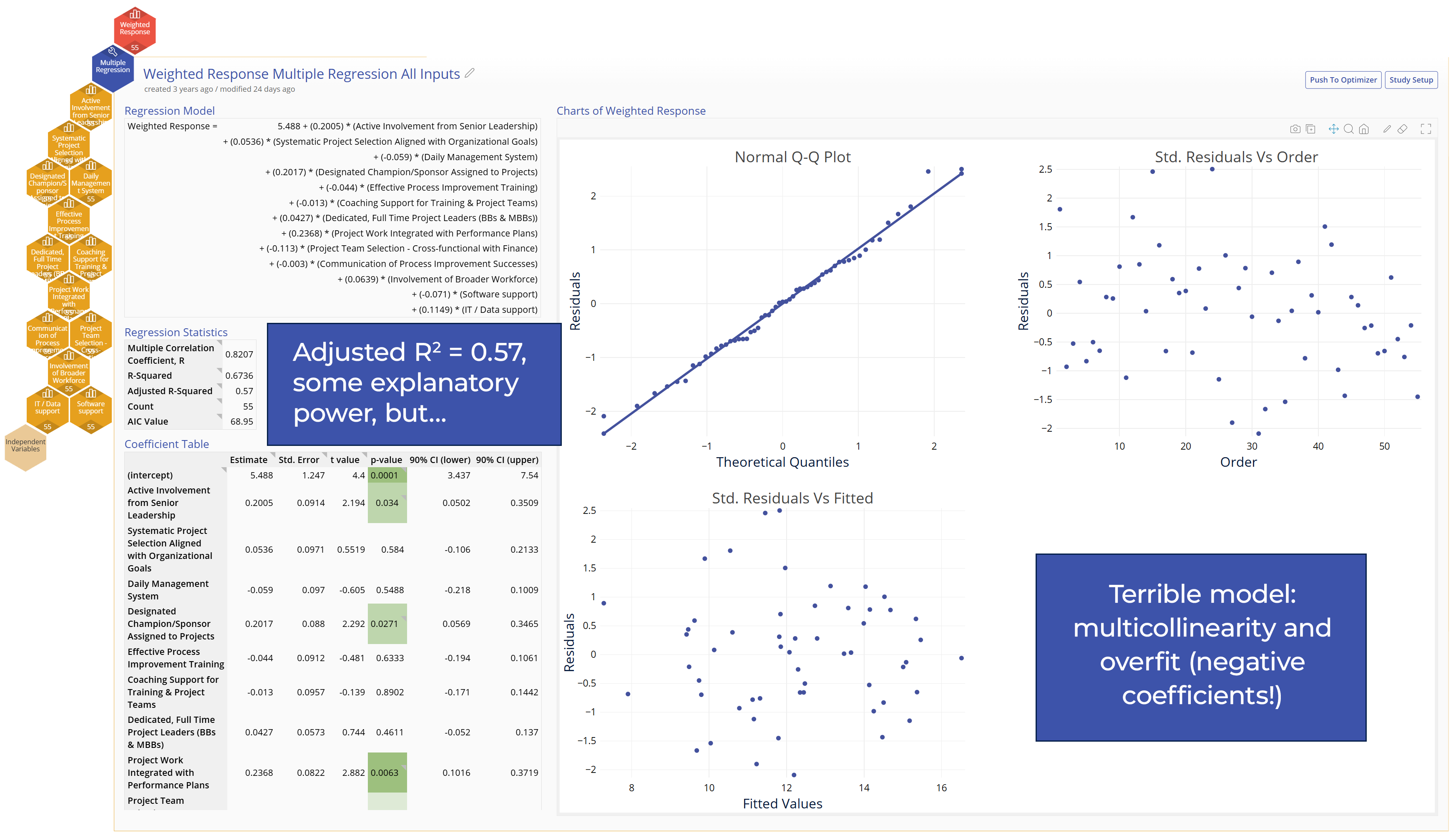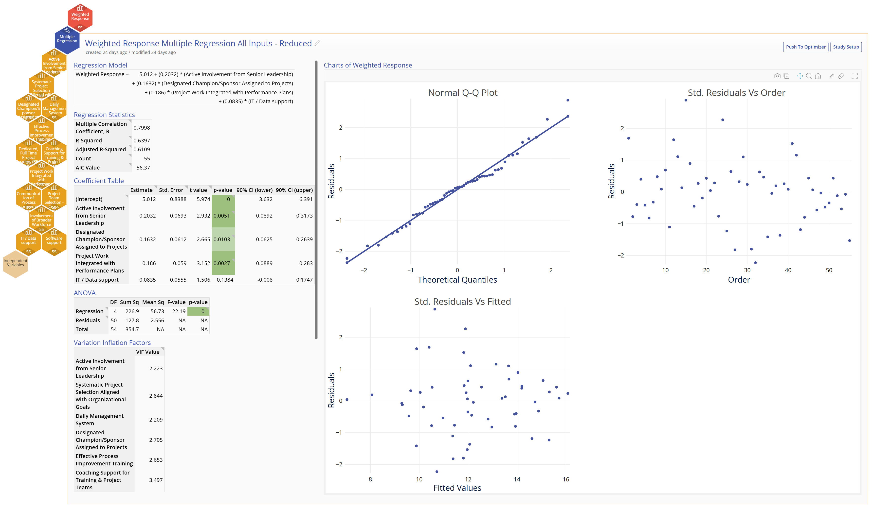 Using the “best subsets” option to reduce the model while minimizing AIC, most of the inputs (independent variables) drop out of the model, leaving only Senior Leadership, Designated Champion, Project Work Integrated with Performance Plans, and IT Support–yielding an Adjusted R2 of 0.61 (with no negative coefficients). That’s a reasonable model, but leaves a fair amount of explaining to do. Optimizing these four inputs alone would seem to leave a lot of improvement on the table.