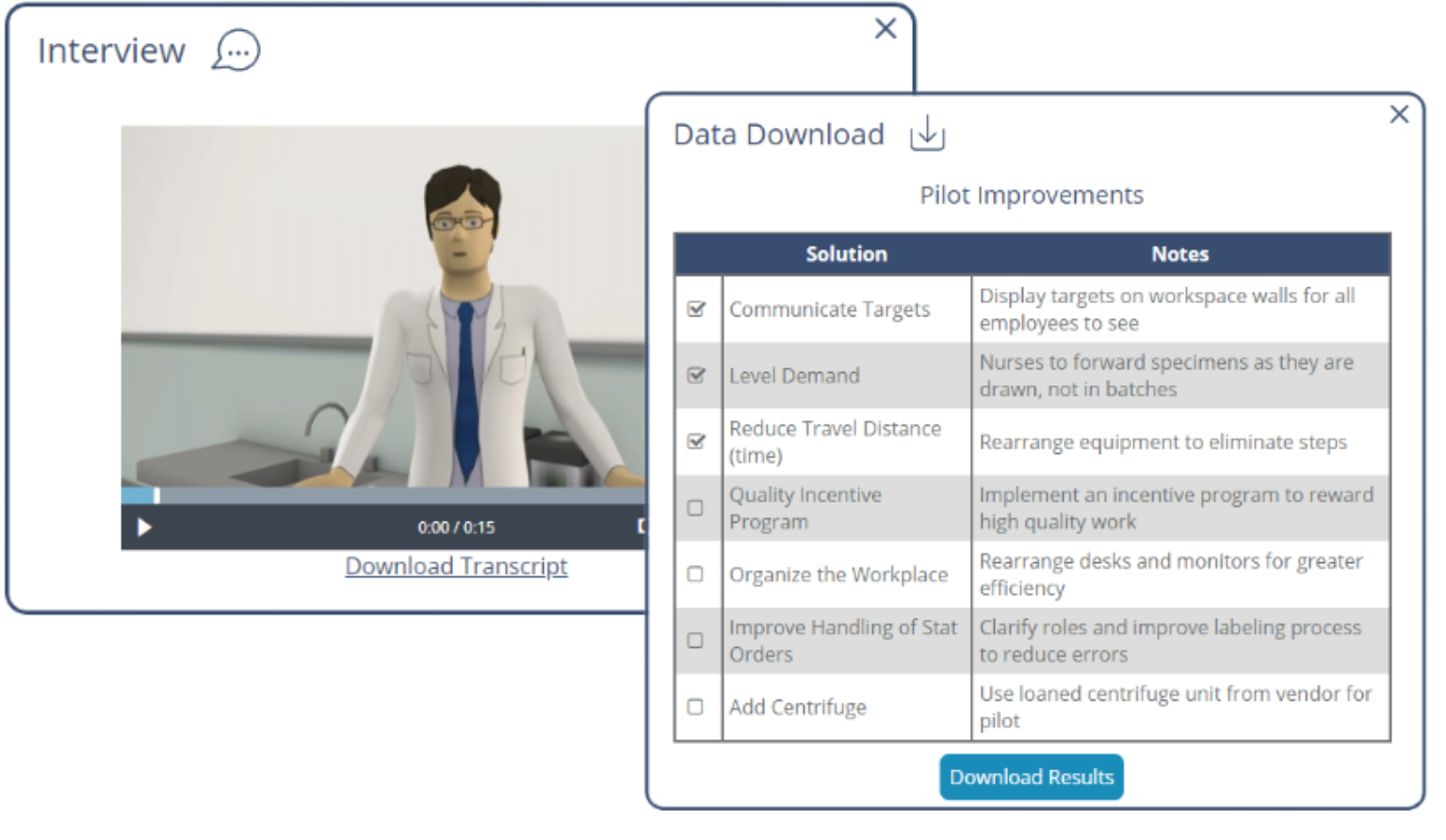As students begin the simulation, they interact with a visual, online process map (gemba) of a project management process where they can interview customers, stakeholders, and employees, collect data and gather process information, analyze data, and take actions to implement improvements. Each project phase throughout the project offers several options (activities) supported by data sets, templates and teaching lessons.