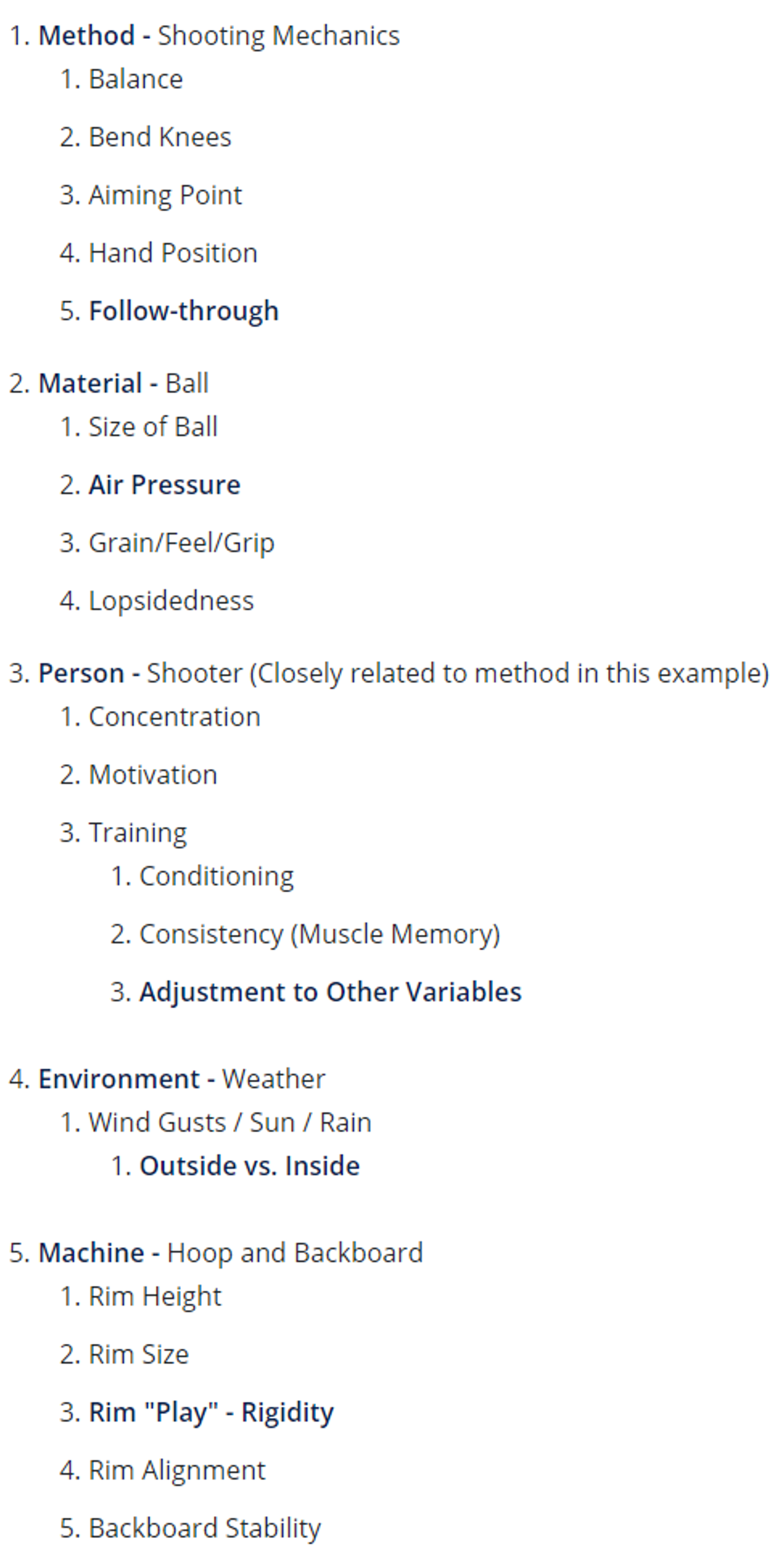 An alternate format for a Cause and Effect diagram is the "indented hierarchy fishbone". This format may be easier to use as it can be easily executed in a word processing or spreadsheet program. Following is an example of our Free-Throw example using the indented hierarchy method: